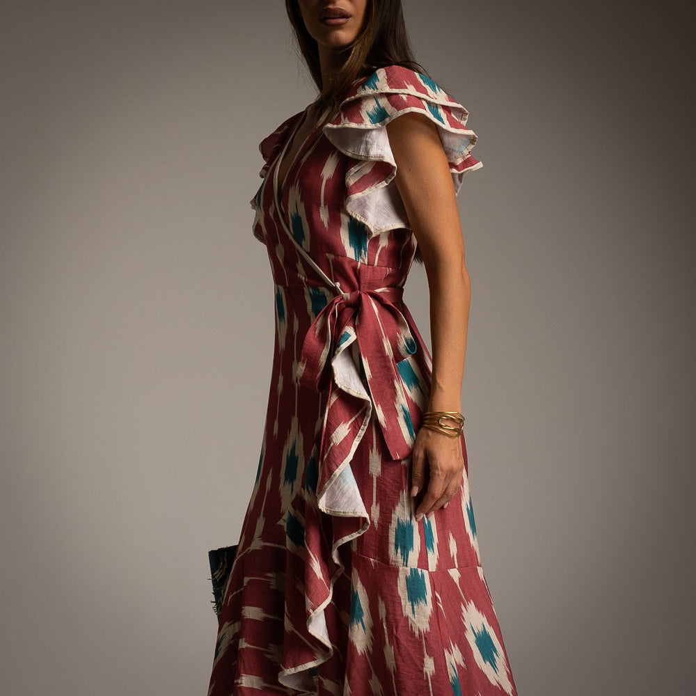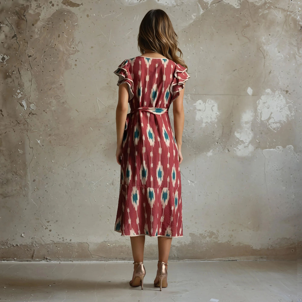 Bring effortless movement and charm into your summer wardrobe with this boho-inspired wrap midi dress, featuring a bold ikat-style print in earthy reds, turquoise, and cream tones. The feminine ruffled sleeves and asymmetrical hem add dynamic flair, while the adjustable wrap tie waist ensures a comfortable and flexible fit for a range of body types.